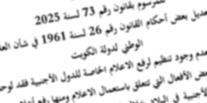 علق المحامي عبدالرحمن الهويشل على المرسوم بقانون رقم 73 لسنة 2025 الصادر أخيرا بتعديل بعض أحكام القانون رقم 26 لسنة 1961 في شأن العلم الوطني لدولة الكويت، والذي جرم رفع أية أعلام أو شعارات بخلاف العلم الكويتي، حفاظا على الوحدة الوطنية وترسيخا للانتماء إلى الوطن.