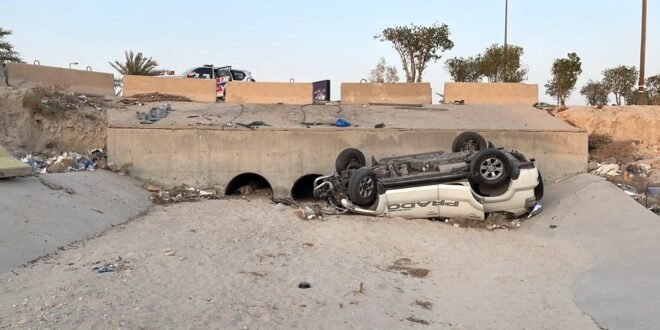 أصيب مقيم عربي وطفلاه جراء انقلاب مركبتهم وسقوطها بحفرة مجرى مياه الأمطار على جانب طريق الدائري السادس وتحديدا مقابل منطقة الجهراء.