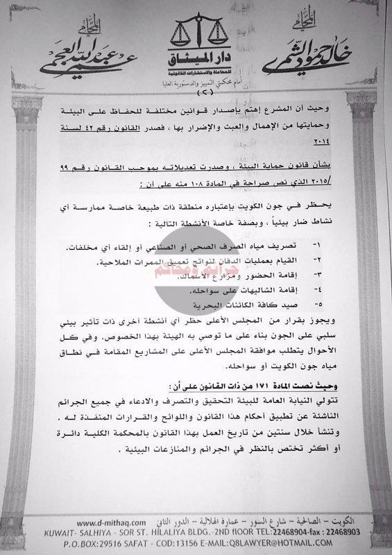 وأكد الشمري اختصاص النيابة العامة بالتحقيق والتصرف والادعاء بجميع الجرائم المتعلقة بحماية البيئة من أية ممارسات سلبية تهدد سلامة مياه البحر وصحة المواطنين والمقيمين، وذلك وفقا لنص المادة 171 لقانون البيئة.