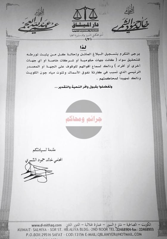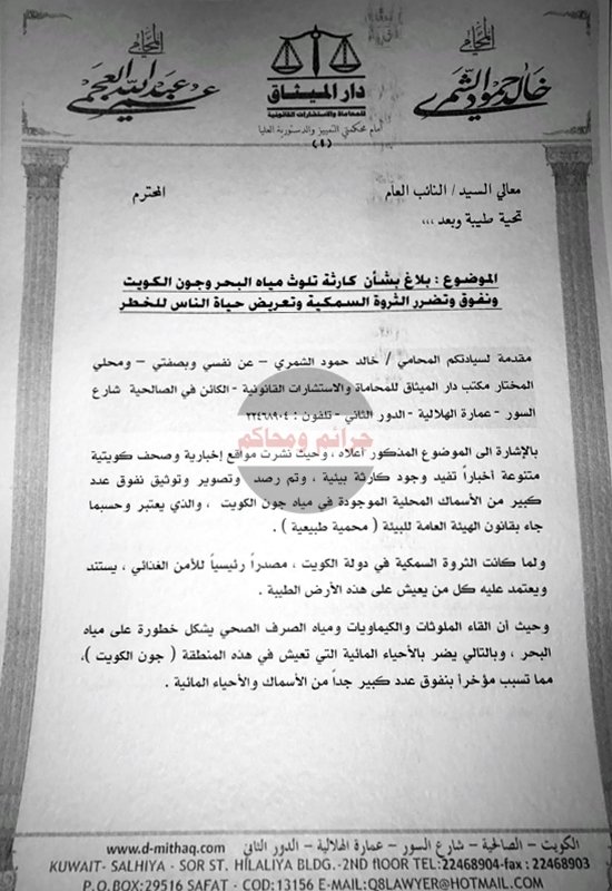 أعلن المحامي خالد الشمري عزمه صباح الغد تقديم بلاغ للنيابة العامة للتحقيق والتصرف بواقعة تلوث مياه البحر وجون الكويت وما خلفته من نفوق للأسماك وتضرر للثروة السمكية فضلا عن تعريضها صحة وحياة المواطنين والمقيمين للخطر.