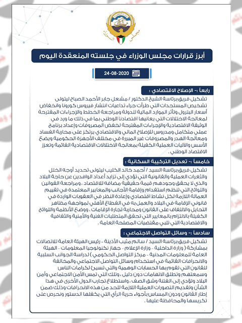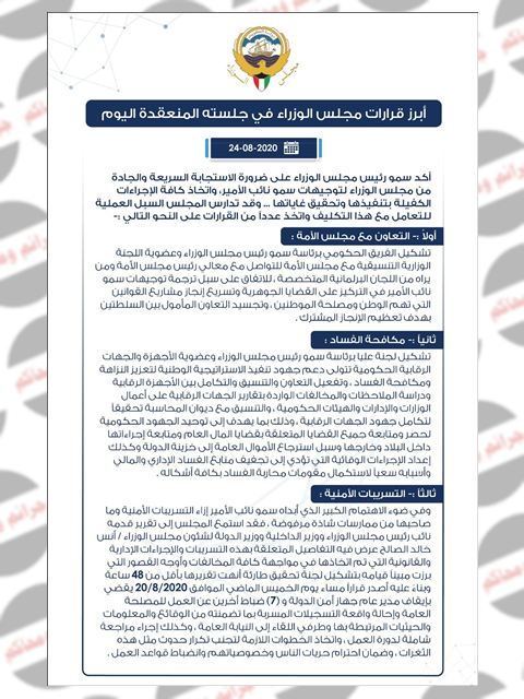 أصدر مجلس الوزراء عدة قرارات في جلسته المنعقدة اليوم، تتعلق بالتعاون مع مجلس الأمة ومكافحة الفساد وقضية التسريبات الأمنية والإصلاح الاقتصادي والتركيبة السكانية ووسائل التواصل الاجتماعي.